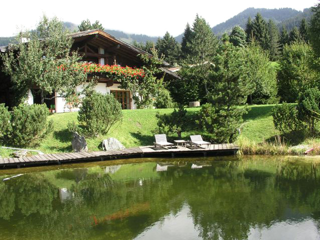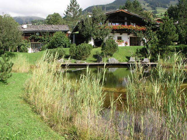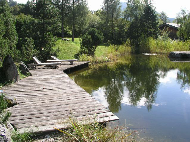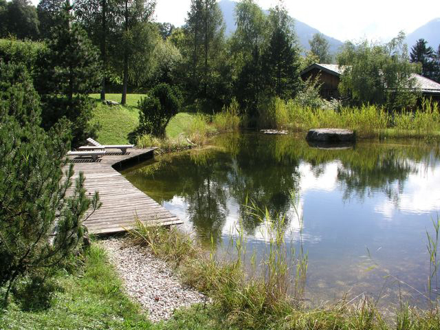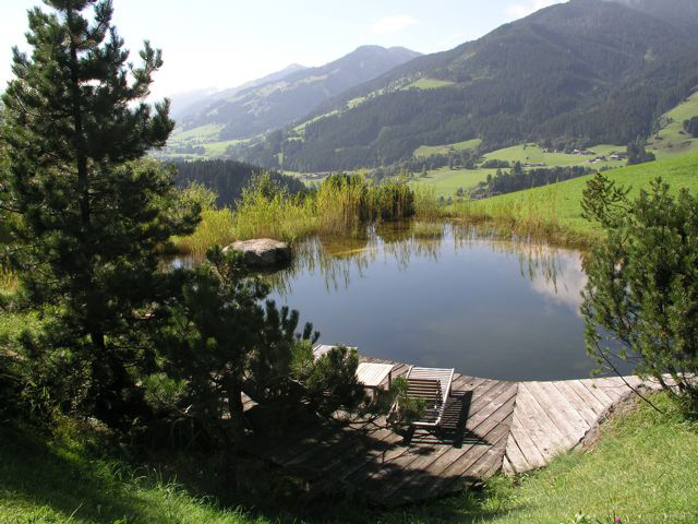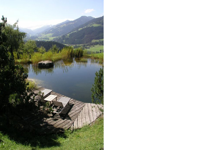 Mit Blick auf die Hohentauern inmitten grüner Almwiesen wirkt dieser Naturschwimmteich wie ein natürlicher Bergsee. Ein Steg aus Lärchenholz wird als Liegefläche genutzt. Ein riesiger, im Teich platzierter Felsbrocken lädt zum Sonnenbaden ein. Über eine grosse Natursteintreppe kann man zum etwas höher gelegenen Wohnhaus gelangen.