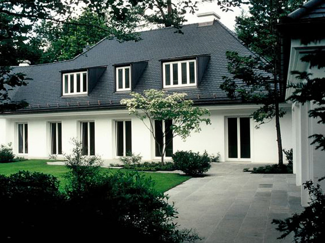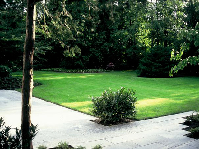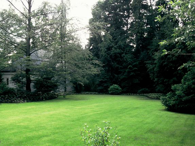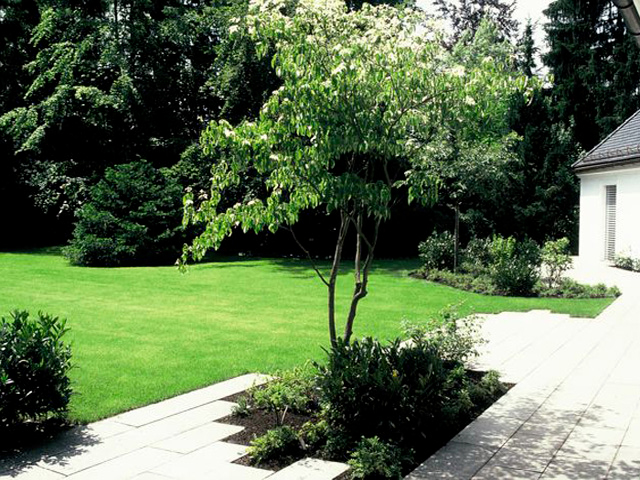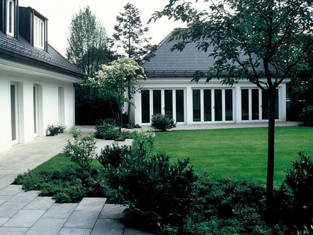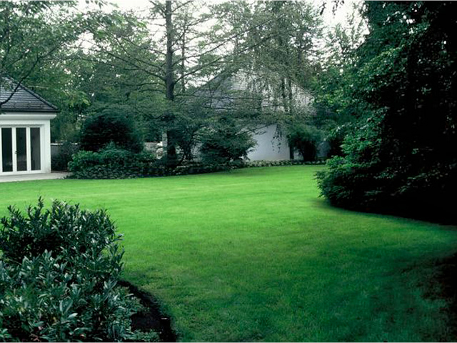 Nach Umbau und Neubezug eines Hauses aus den fünfziger Jahren mit seiner angenehmen Schlichtheit und eleganten Aussage verlangte dieses Anwesen nach einem Garten mit klarer Formgebung und flächiger, offener Gestaltung. Großen Wert wurde auf die Bepflanzung und Abpflanzung zu den Nachbar-grundstücken gelegt, um den parkähnlichen Charak-ter des Gartens zu erhalten und zu verstärken.