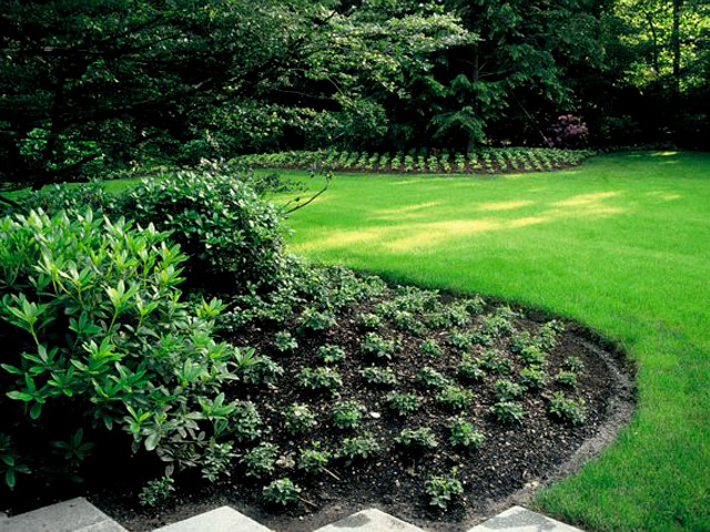 Durch das Pflanzen von 10 m hohen Hemlocktannen und grossen Rhododendron-Solitären entstand in Verbindung mit vorhandenen Gehölzen ein waldähn-licher Gehölzrand, der alles Ungewollte ausblendet und das Grundstück viel größer erscheinen läßt, als es tatsächlich ist.