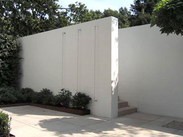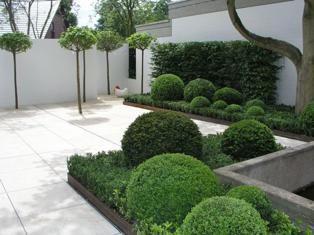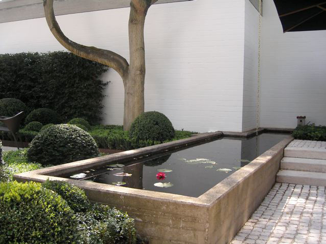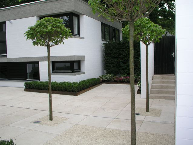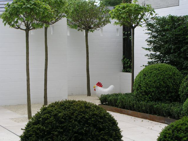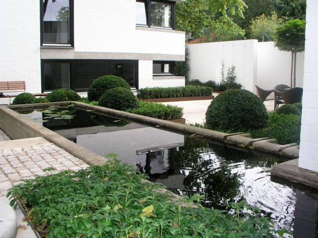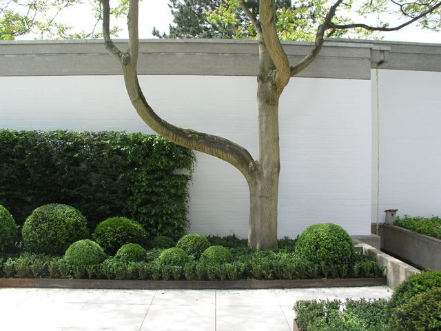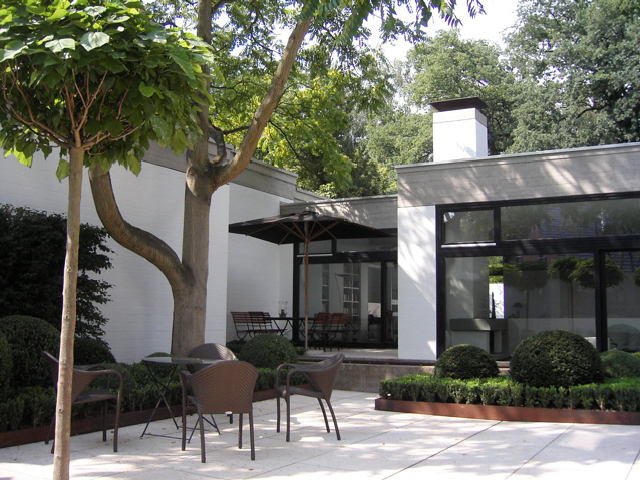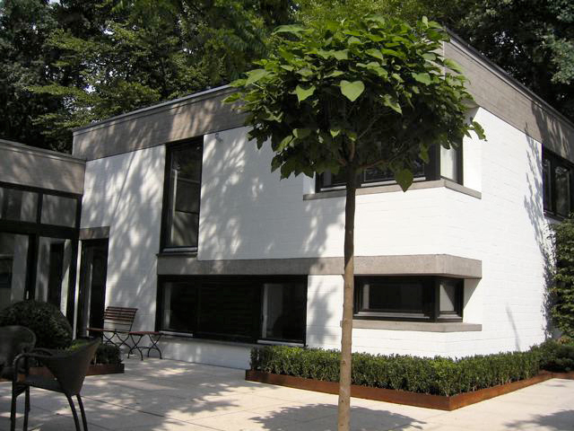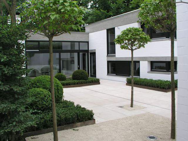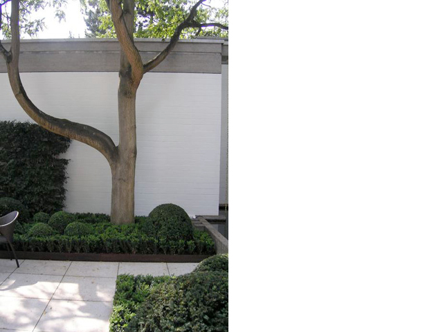 Ein Haus im Bauhausstil, bei dem der Garten die Fortsetzung der Architektur im Außenraum darstellt und dennoch eigenständige Elemente aufweist – wie z. B. bei den Pflanzeinfassungen aus Cortenstahl, die leicht diagonal in den Raum gestellt wurden, um den rechten Winkel aufzuweichen. Die immergrünen Flächen und Kugeln aus Buchsbaum und Eiben vor den weissgestrichenen Betonwänden sind ein weiterer Versuch den Raum zu vermenschlichen, ohne die Strenge der Anlage zu verwischen. Sie sind gleichzeitg der Hintergrund für eine Sitzgruppe, die mitten im Hof stehend, den Innen- mit dem Außenraum optisch verbindet. Ein Gruppe von fünf freigestellten Tulpenbäumen mit ihren über die Mauer ragenden Kronen stellt den Bezug zur freien Landschaft her, und so wird auch hier die Dominanz der Mauer entschärft, ohne sie vollends auszublenden. Diese vielen, reduziert eingesetzen Elemente aus Grün führen zu einer differenzierten, stimmungsvollen Atmosphäre, die einerseits die Architektur akzeptiert und gleichzeitig mit den Mitteln der Natur überhöht.