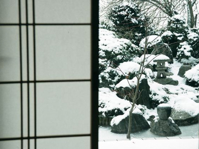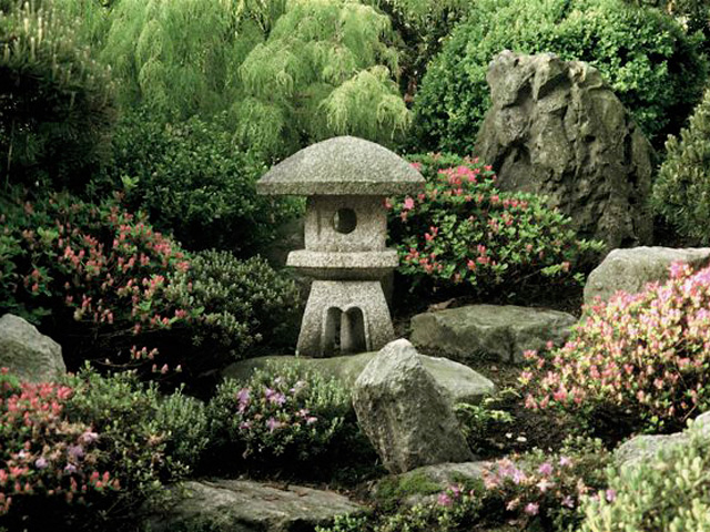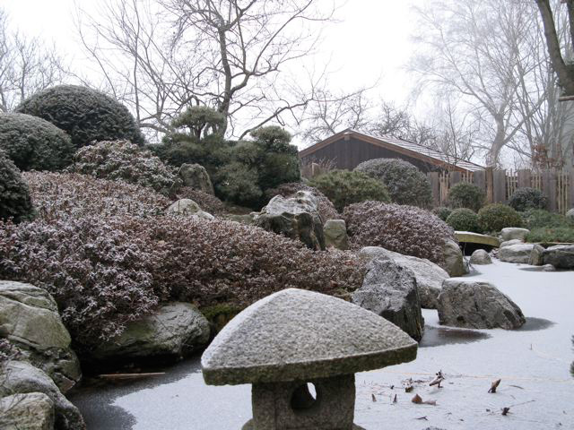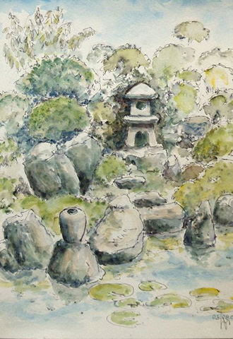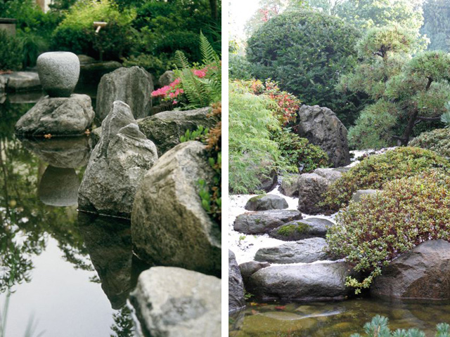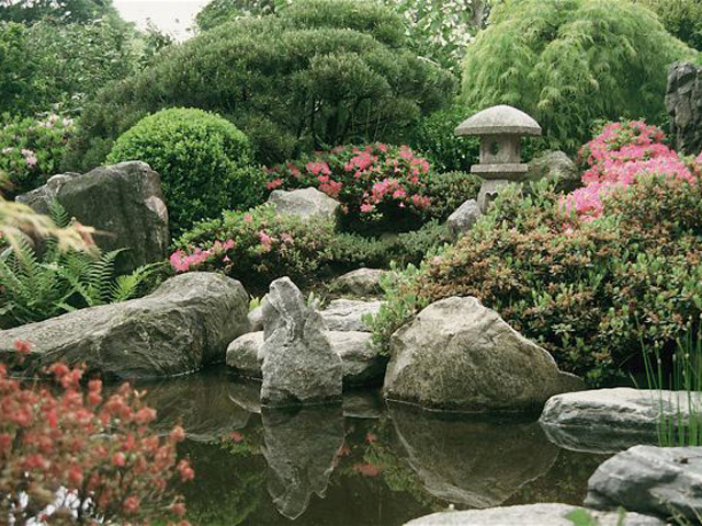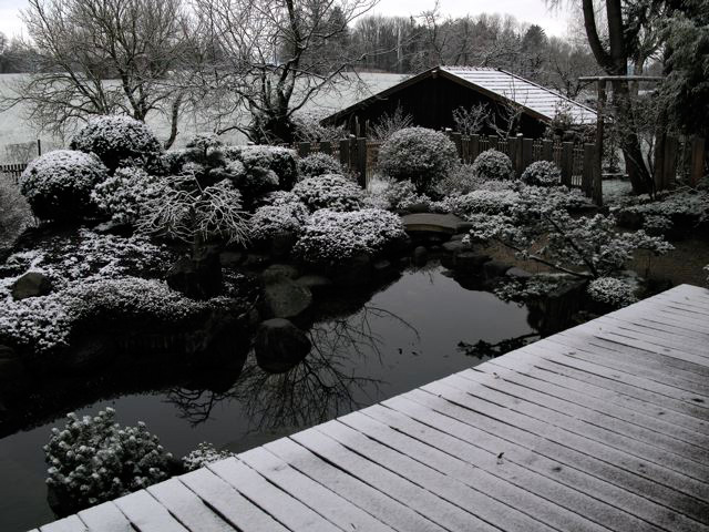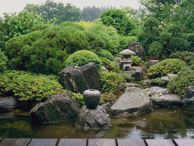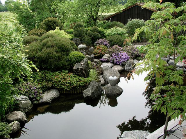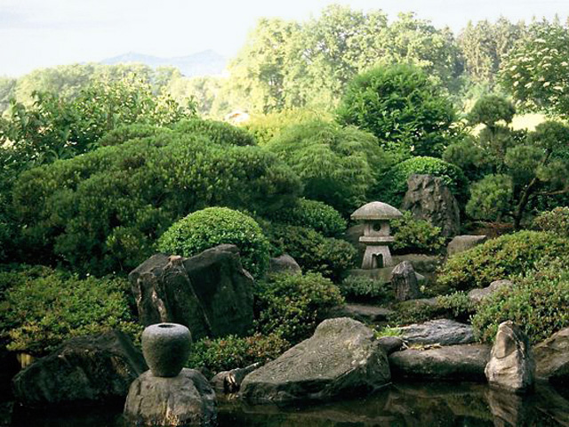 In diesem Garten wurde der Ausblick in die Landschaft zum Bestandteil der Komposition. Der schon bestehende Hintergrund aus Bergen und Bäumen in der Ferne sollte sich möglichst übergangslos in die Teichgestaltung einfügen. Dazu wurde die unerwünschte Horizontlinie im Mittelgrund durch immer-grüne Gehölze und beschnittene Azaleenflächen ausgeblendet, die Tiefe des Landschaftsraumes verkürzt und in den Gartenvordergrund verlegt. Das so erschaffene Bild, einem Landschaftsgemälde gleich, vermittelt dem Betrachter, von der Veranda blickend, ein Gefühl vollkommener Ruhe und Harmonie.