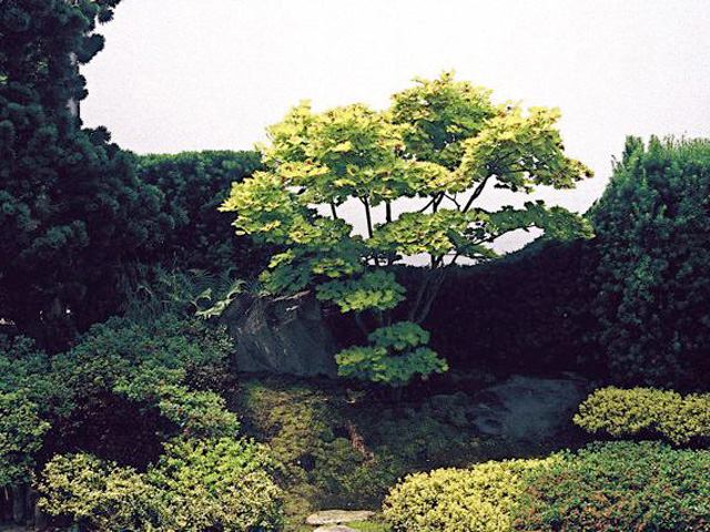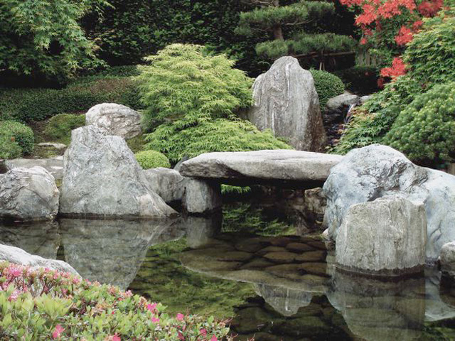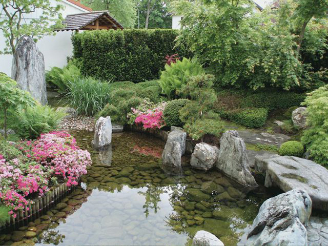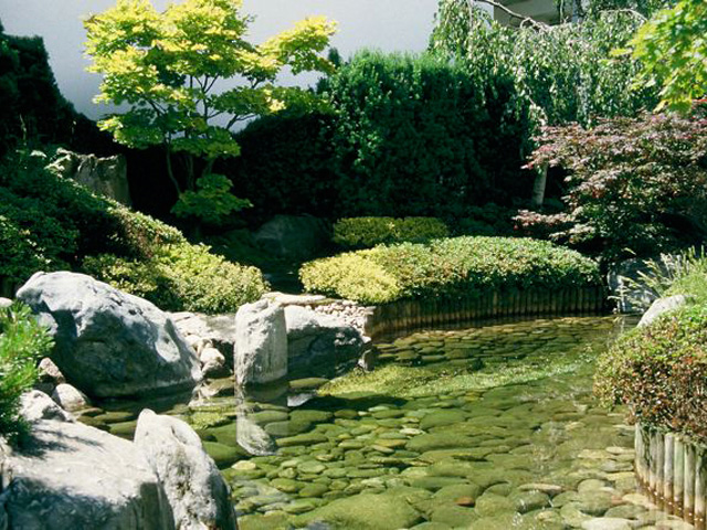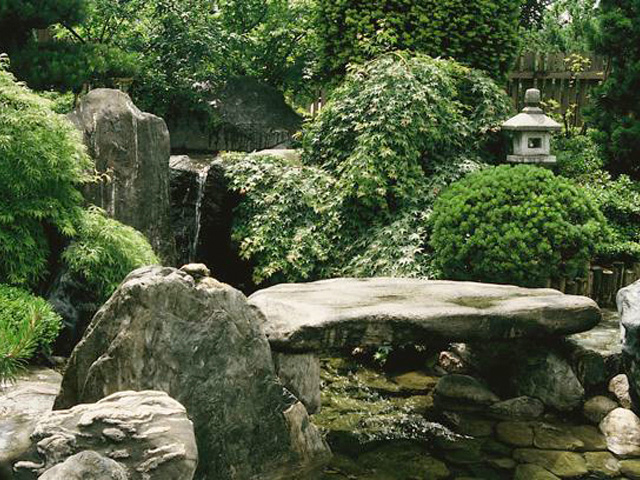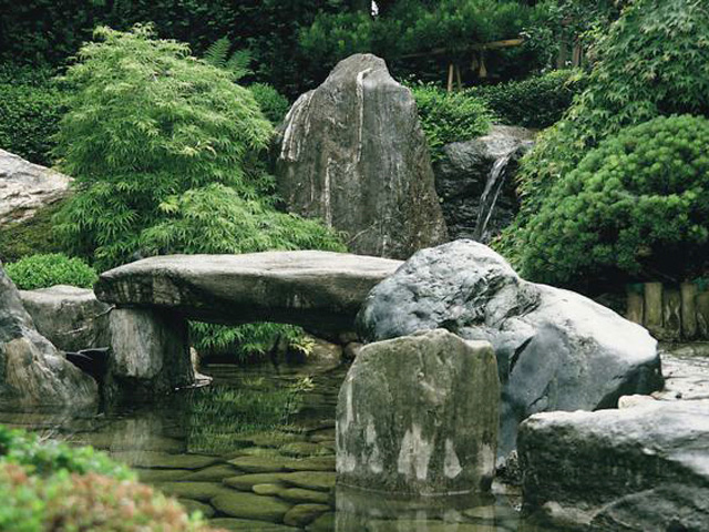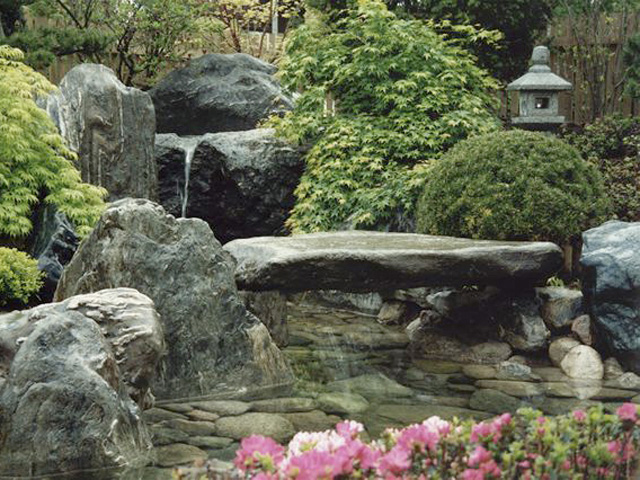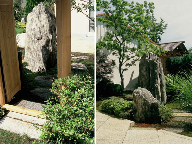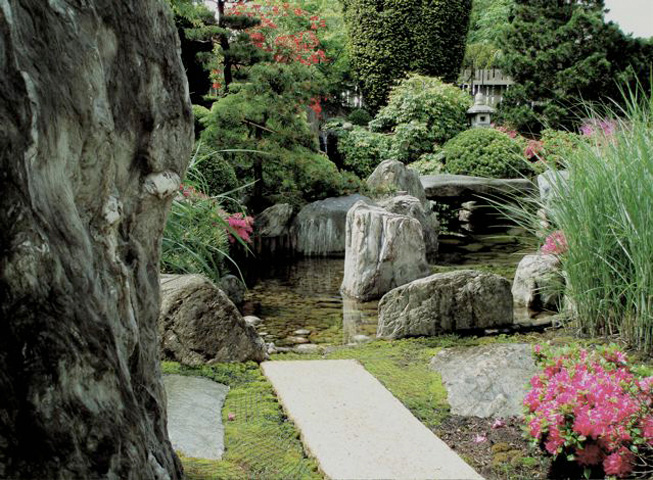 Nach einem gemeinsamen Besuch in Japans Gartenhauptstadt Kyoto wünschten sich die Auftraggeber auf ihrem Heimatgrundstück einen Garten mit der Atmosphäre, die sie in den wunderbaren Gärten dort so sehr berührt hatte. Hauptgestaltungselement sollte ein Wasserfall mit vorgelagerter Felsenbrücke sein, als Teil eines Rundweges um den Gartenteich. Besonders die Suche nach dem ersehnten Felsmaterial und in Grösse und Art passenden Gehölzen gestaltete sich aufwändig. Bei soviel Hingabe an Detaillösungen überraschte es nicht, dass der Kunde die intensive Pflege übernahm und mit selbstangelegten Moosflächen das Erscheinungsbild einer in Deutschland beheimateten Gartenanlage in ungewöhnlicher Weise bereicherte.