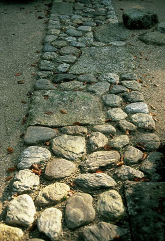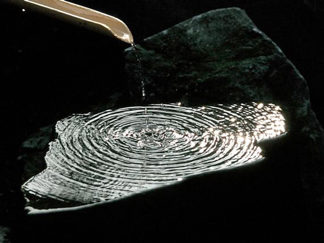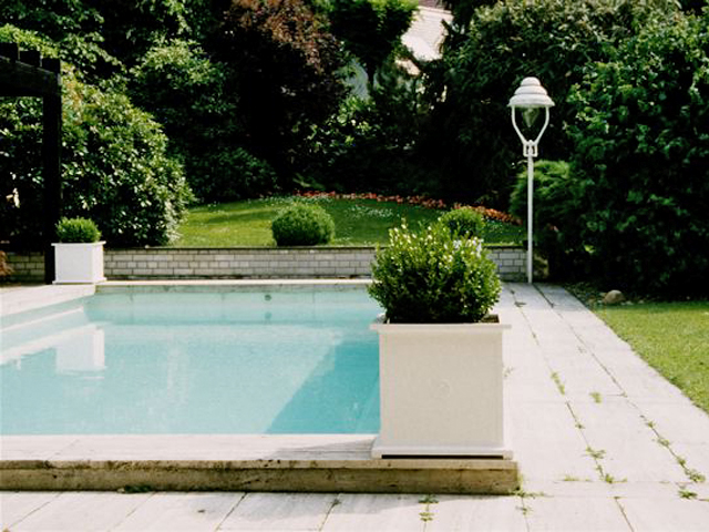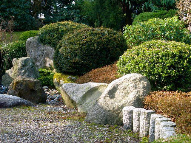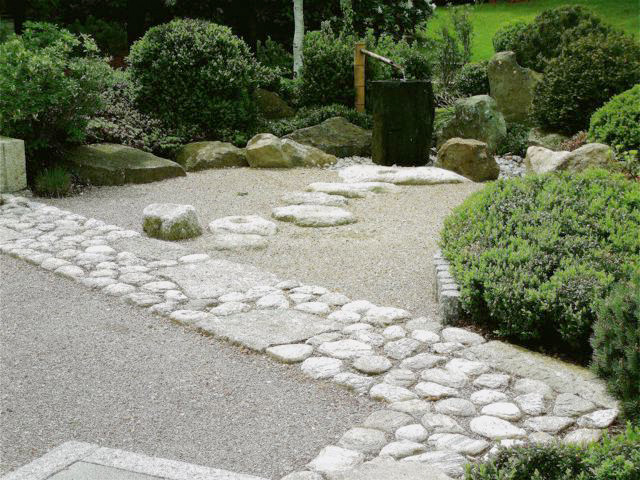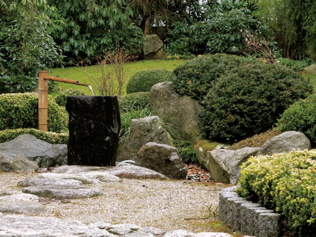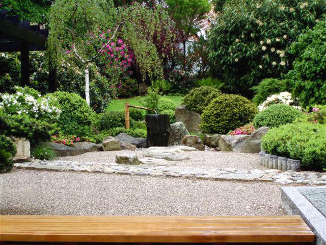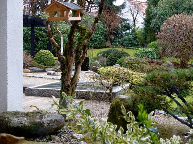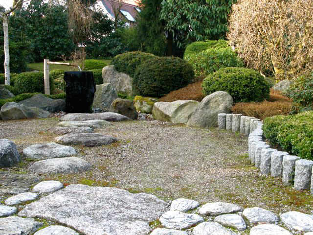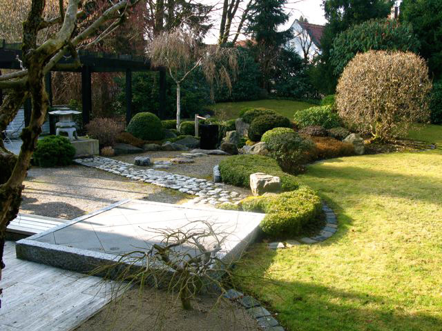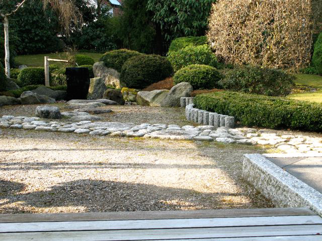 In dem Bereich des Geländes, in dem früher ein Swimmingpool lag, sollte jetzt, in den vorhandenen Garten eingebettet, ein japanisch inspirierter Kiesgarten entstehen. Die Komposition um einen Quellstein (jap.: Tsukubai) sollte außerdem noch eine aus Japan importierte Steinlaterne ( jap.: Yukimi) und einen aus einer Eibe getrimmten Gartenbonsai (jap.: Niwaki) enthalten. Wir rahmten den einen rechten Winkel der alten Poolform mit einer Zedernholzabdeckung ein und lösten den anderen so auf, dass das vorhandene Gartengelände über eine Hügelgestaltung in den neu entstandenen Raum einfließen konnte. Wichtiges Detail ist die Raumeinteilung, beginnend mit einem höher gelegenen Auftaktplateau. Von hier aus sieht der Besucher zum ersten Mal die durch den Gartenbonsai bisher verborgen gebliebene Steinlaterne. Auf einem kunstvoll angelegten Naturstein-weg gelangt man dann durch eine kiesige Sandfläche zur Laterne und dem Quellstein aus grünem Basalt.