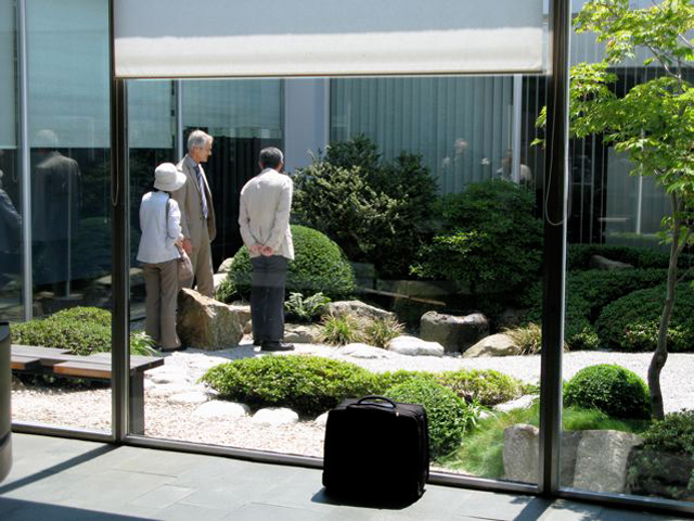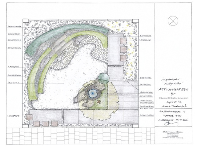 Der Stil dieses Atriumsgartens dient der Kontemplation, wozu sich der Betrachter an vorbestimmten Plätzen zum Gartenbild positioniert. Ziel der Gestaltung, ist es dabei, das innere Wesen der Natur zu imitieren, nicht ihre äußere Erscheinungsform. Das Hauptgestaltungselement in diesem Entwurf ist die Stimmung der tiefen Bergwelt mit ihren Quellen und Schluchten: