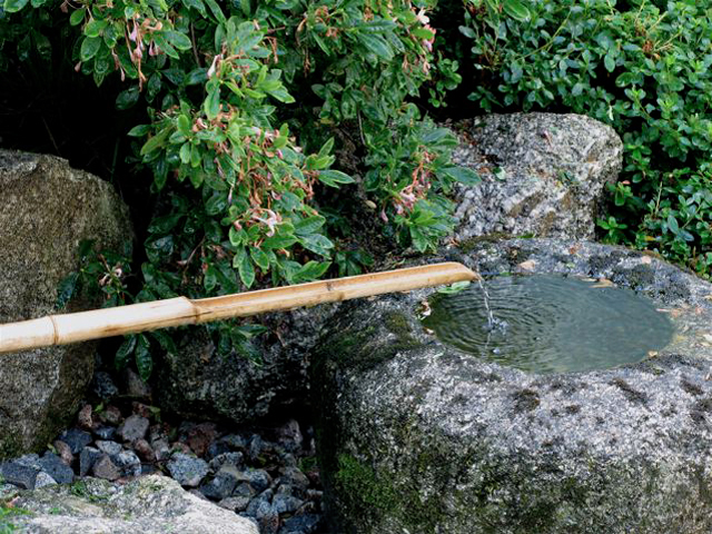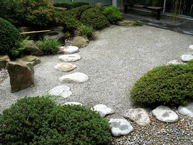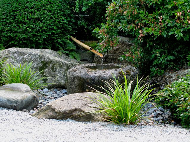 Ein Gartenbesucher hat still unter dem schützenden Blätterdach des Bambushains Platz genommen. Andere haben sich achtsam über die im Kiesbett verlegten Trittsteine aufgemacht. Jetzt blicken alle auf die vor ihnen liegende Landschaft, bestaunen zerklüftete Felswelten und lauschen dem sanften Murmeln eines fernen Gebirgsbaches. In der Ebene hat er einen See gebildet, der sich bis zu ihren Füßen ausdehnt.