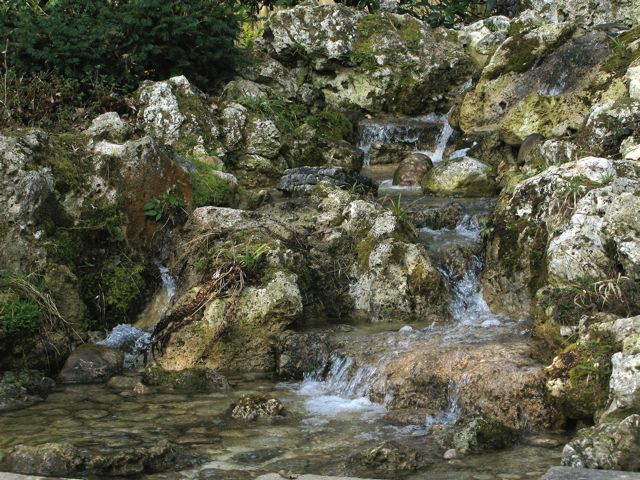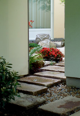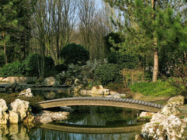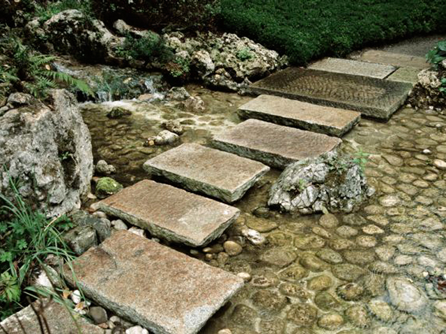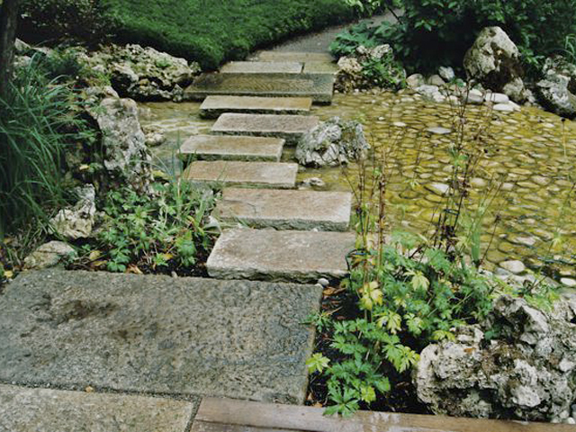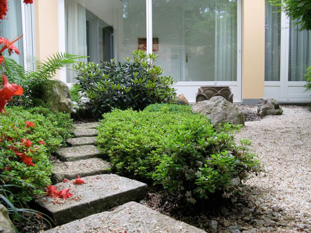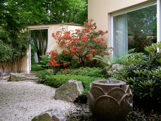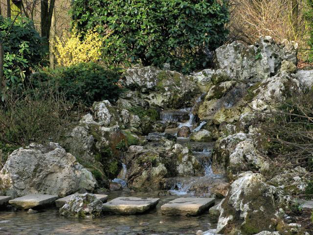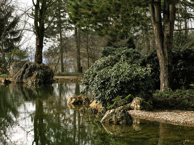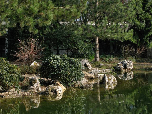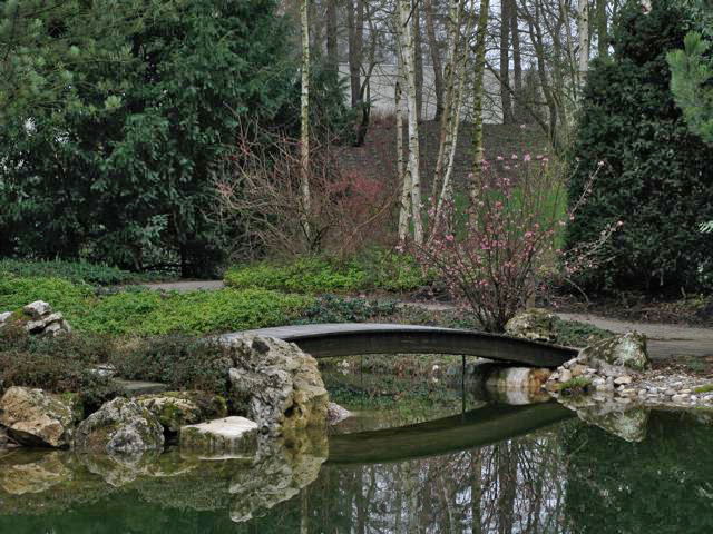 Die notwendig gewordene Renovierung eines Naturschwimmteiches führte zu der Idee, einen Wildbach und kunstvoll gestaltete Uferpartien mit in die Gesamtgestaltung einzubinden. Von der Hauptterrasse aus geht der Blick über den Teich zu einer mit mächtigen Schwarzkiefern bewachsenen Insel. Felsgruppen und stattliche Rhododendronbüsche gliedern den großen Gartenraum in mehrere kleine, mit dem Ziel, eine allumfassende Harmonie beim Anblick dieser Szene zu erzeugen. In der Ferne entspringt auf der Kuppe eines künstlichen Hügels, hinter schroffem Felsgestein verborgen, eine Quelle. Von dort, über Kaskaden stürzend, verbreitert sich das mit handverlesenen Kieselsteinen ausgepflasterte Bachbett, bis es den Teich erreicht. Der Gartenrundweg führt an dieser Stelle über kunstvoll versetzte Natursteinplatten zu einer kleinen Holzterrasse, die zum Verweilen an dieser Bachidylle einlädt.