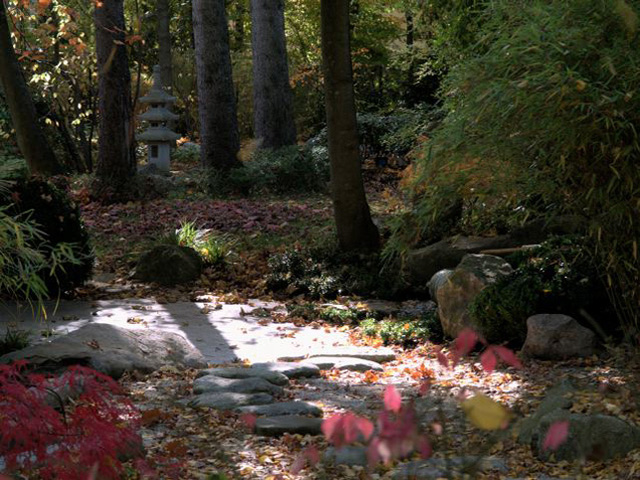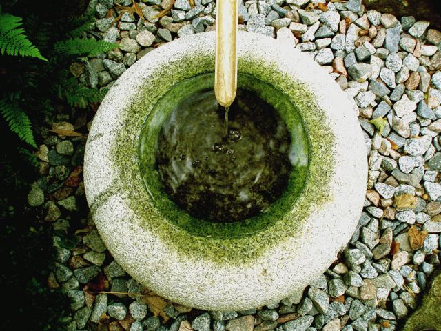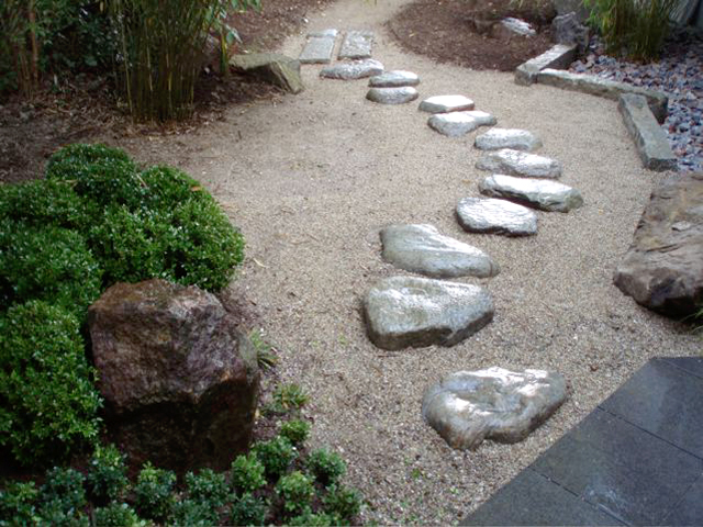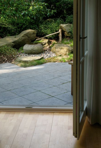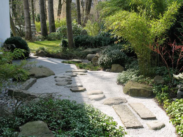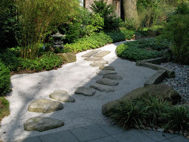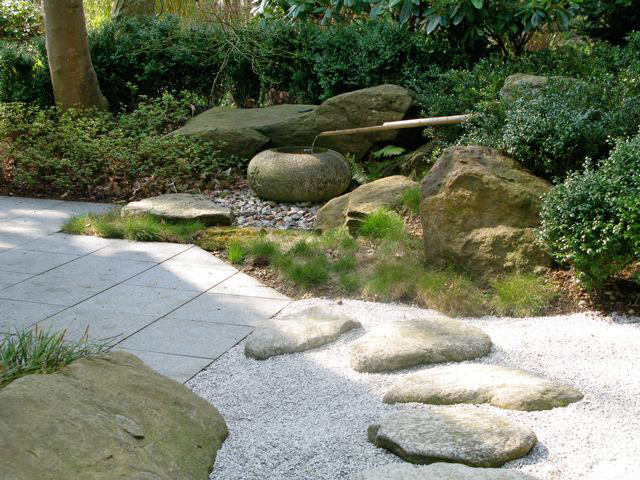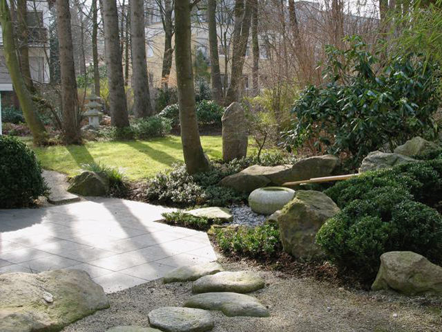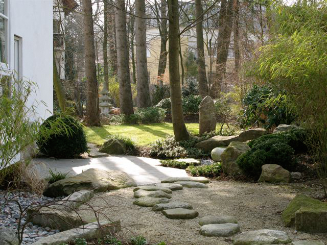 Dieses eingewachsene Grundstück mit seinen starken Vertikalen aus schattenspendendem Mischwald drängte nach einem horizontalen Ausgleich. Eine Komposition aus länglichen baumstammartigen Felsen, liegenden Granitstelen und einem flachen Quellstein mit Trittsteinen in einem hellen Kiesbett verlegt, zieht die Blicke des Betrachters sogleich unter die Horizontlinie. Die Höhepunkte der Gestaltung sind vom Inneren des Wohnhauses durch Panoramafenster im Blickfeld der Bewohner. Zu jeder Tageszeit bereichert die ständig wechselnde Lichtatmosphäre den Garten um eine Gestaltungsebene von besonderem Charme.