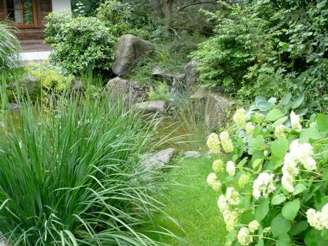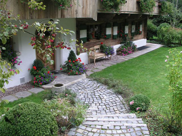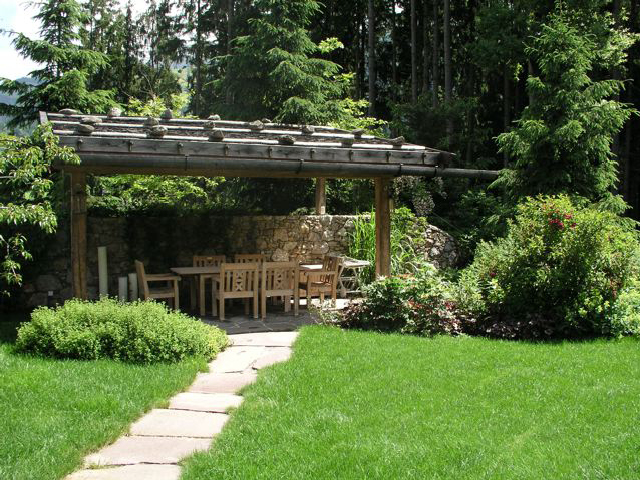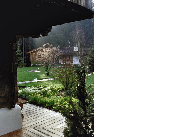 Bei diesem Grundstück war der Außenraum ein wich-tiges Verbindungsstück zwischen zwei Wohnhäusern und einem überdachten Freisitz. Der Freisitz mit seiner Natursteinmauer schließt das Gelände Rich-tung Osten ab, von wo es Richtung Tal steil abfällt. Gleichzeitig ist der Freisitz ein wichtige optische Barriere zwischen Grundstück und einem finster an-mutenden Fichtenwald. Ein kleiner Teich mit Wasser-fall stellt einen weiteren Höhepunkt des Gartens dar. Wichtige Blicke in Richtung Hornbahn wurden frei- gehalten und der Bezug zur offenen Landschaft hergestellt.