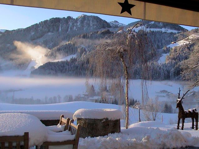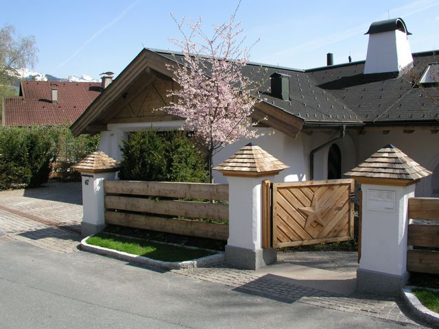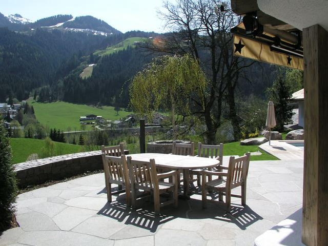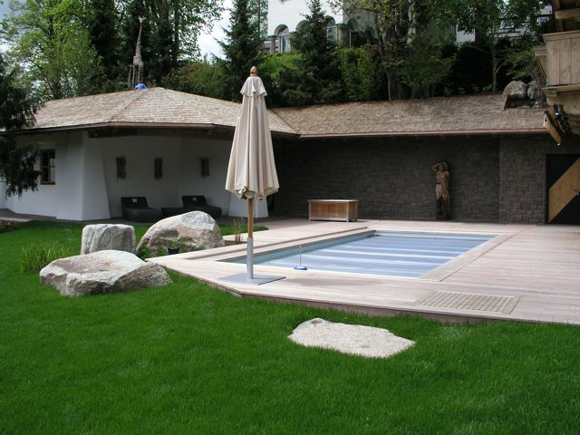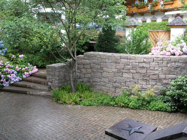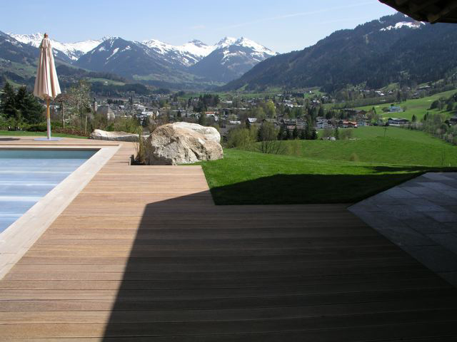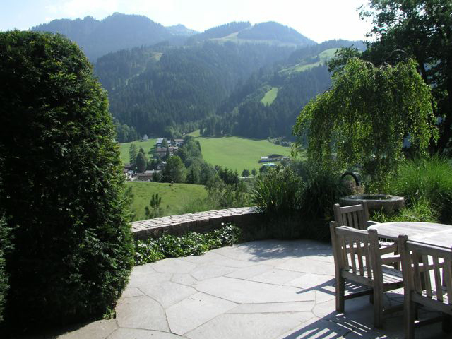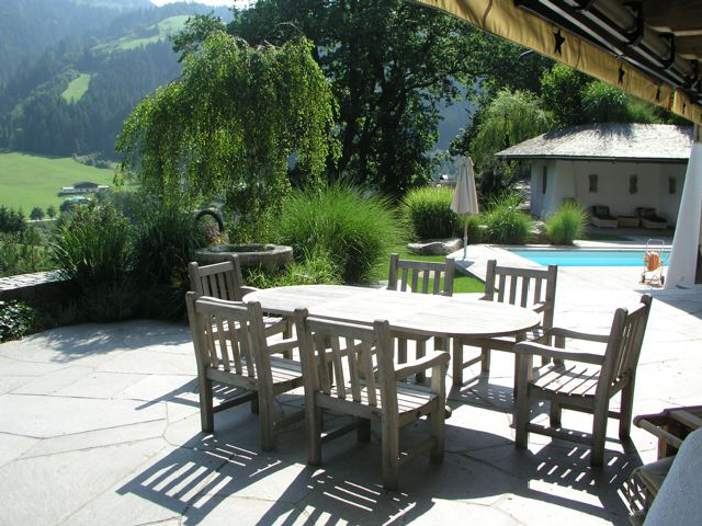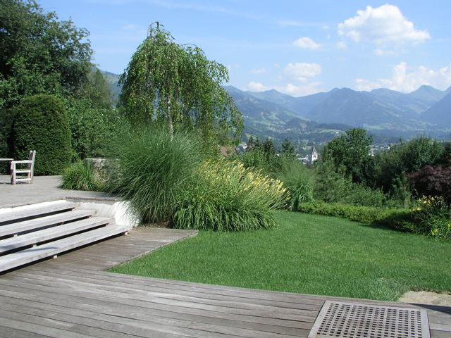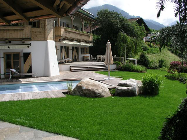 Die Terrassierung des steil abfallenden Grundstücks bildet auf Höhe des bereits vorhandenen Pools eine zweite Ebene. Eine langgezogene Holztreppe verbindet diese Ebene mit der Terrasse im oberen Bereich des Hauses, von wo sich ein grandioser Blick auf die umliegenden Berge bietet. Dieser obere Terrassenbereich wird geprägt durch einen sehr alten Granittrog an exponierter Stelle und eine Hängebirke. Der neugeschaffene Freisitz begrenzt das Grundstück in westlicher Richtung und erzeugt im Bereich des Pools ein Hofsituation. Talseitig wird dies durch eine massive Steinsetzung gegründet, ein Verweis auf die umliegende Natur, in die sich die gesamte Anlage fließend einbettet. Die Gestaltung der Anlage entspricht durch Konzentration der Bepflanzung auf wenige einheimische Gehölze und standortgerechte Stauden dem Gebirgsklima mit seinen kurzen Sommern und langen Wintern und ergänzt die natürliche Schönheit der sie umgebenden Natur.