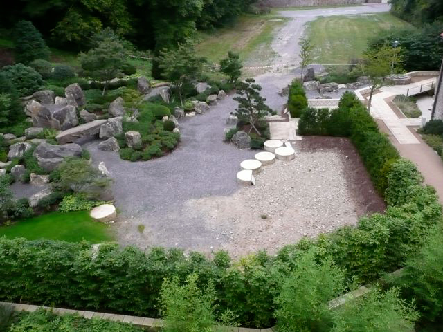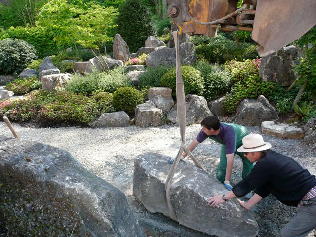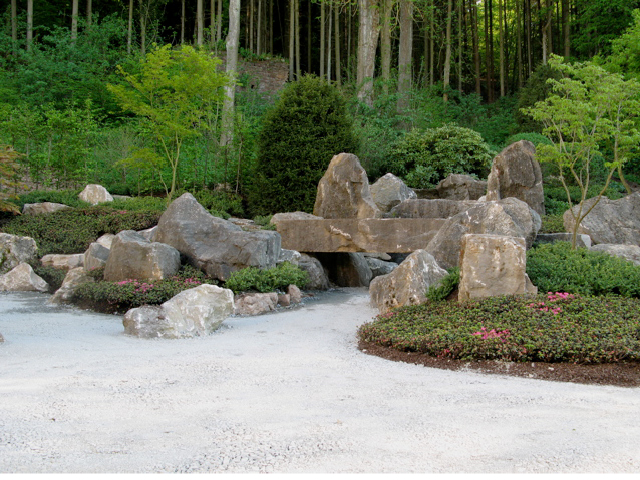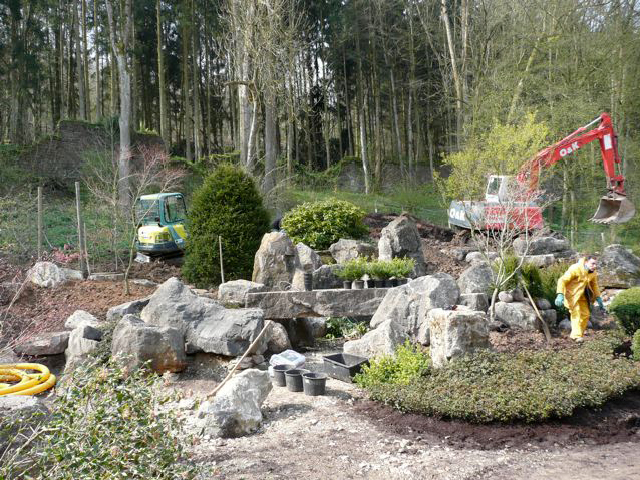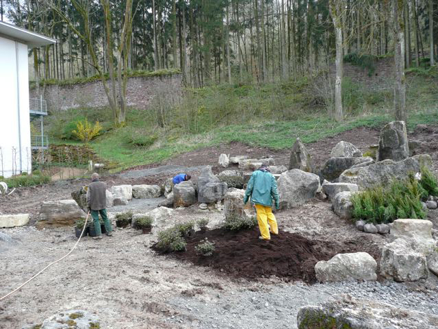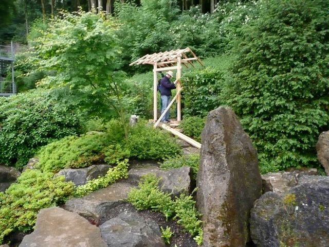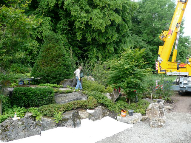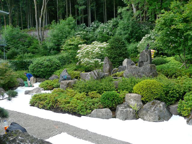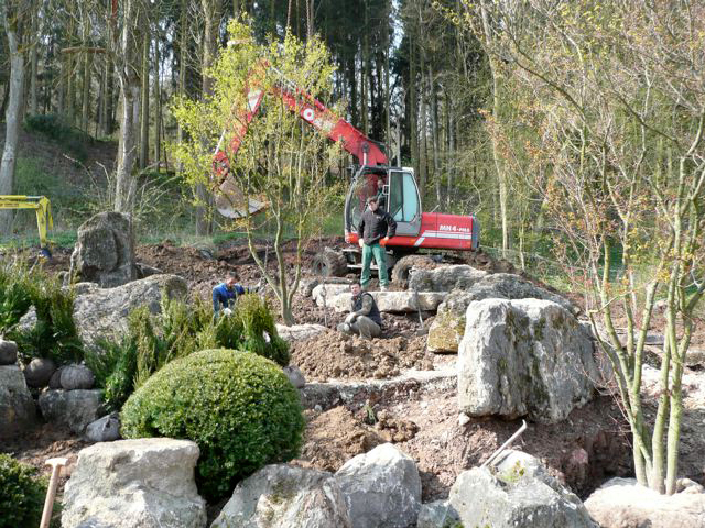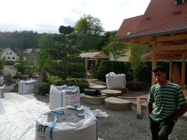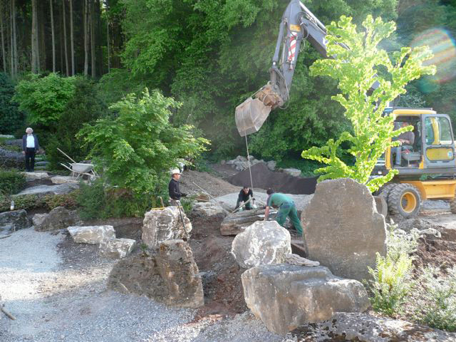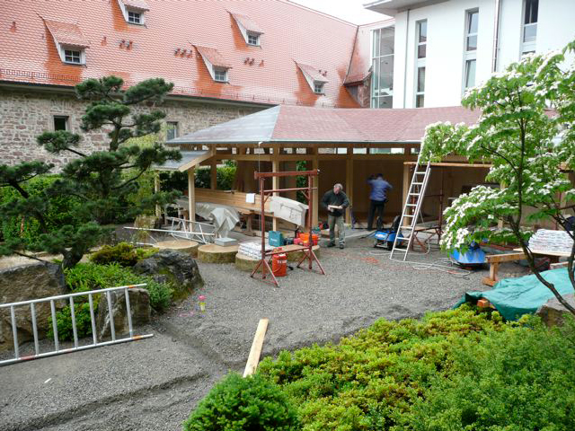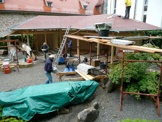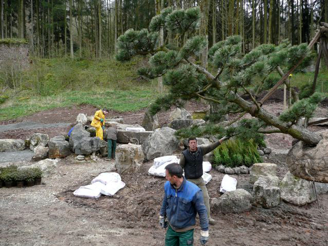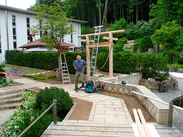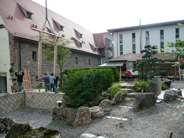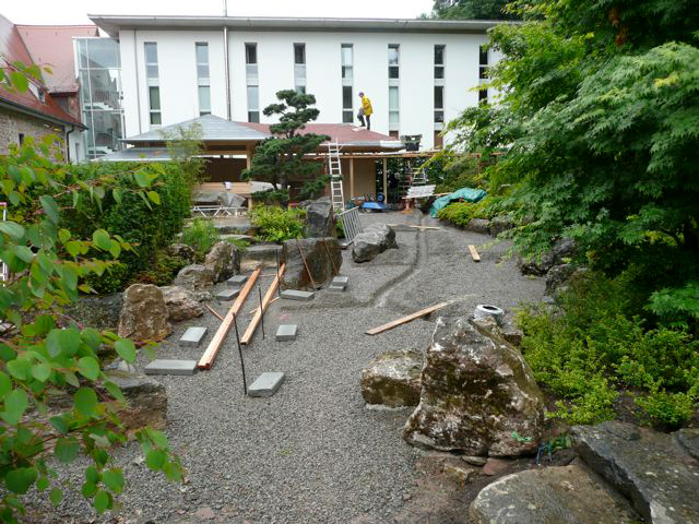 Die Arbeit an diesem Japanischen Meditationsgarten in einer alten Klosteranlage begann mit dem Einfrieden der eigentlichen Gartenfläche und dem Bau von Wegeflächen, Mauern und der Eingangssituation. In einem nächsten Schritt wurden rund 300 Tonnen Felsmaterial gesichtet und im Gelände versetzt. Hauptthema dieser Steinsetzung ist ein Trockenwasserfall mit einem massiven Quader als Brücke, flankierenden Felsen und einer Wegeführung, so dass dieser Garten auch begehbar sein wird. Die nächste Bauphase war die Bepflanzung des Gartens mit großen Solitärgehölzen, Gehölzflächen und Bodendeckern. Im letzten Bauabschnitt, Anfang Juni 2009, wird neben Eingangstor und Holzbrücke eine Meditationshalle errichtet. Im letzten Arbeitsgang wird ein speziell hergestellter Kies im Garten verteilt, der für diesen im „Trockenlandschaftsstil“ errichteten Garten typisch ist.