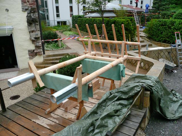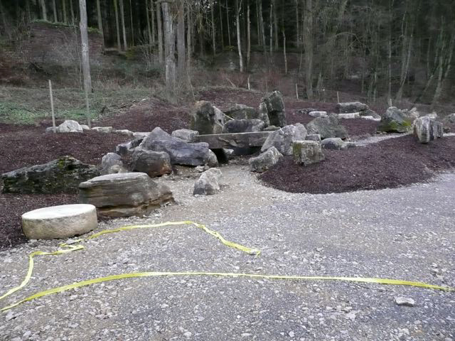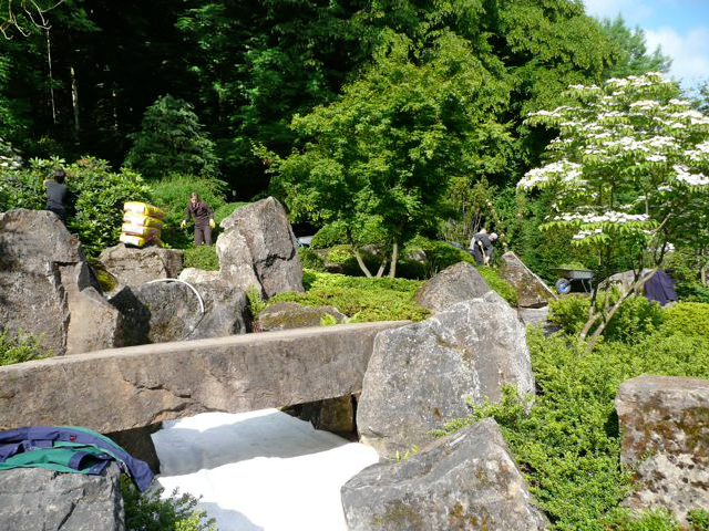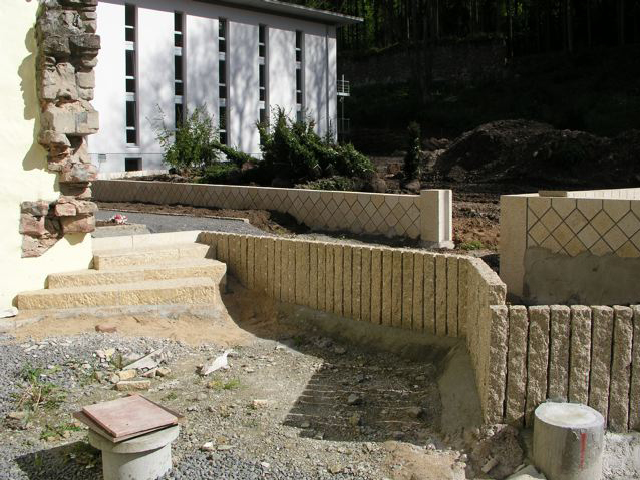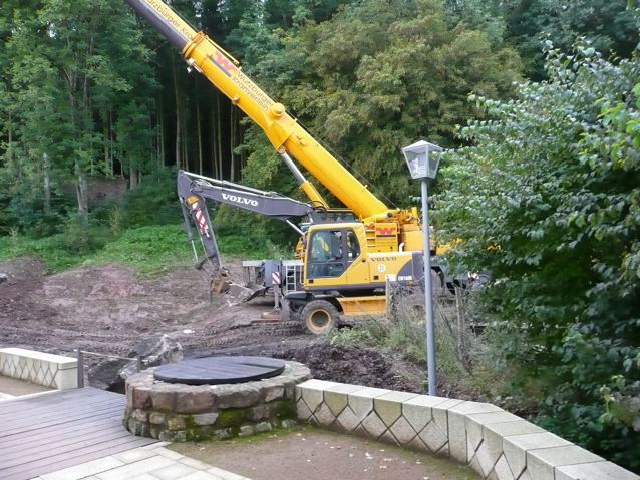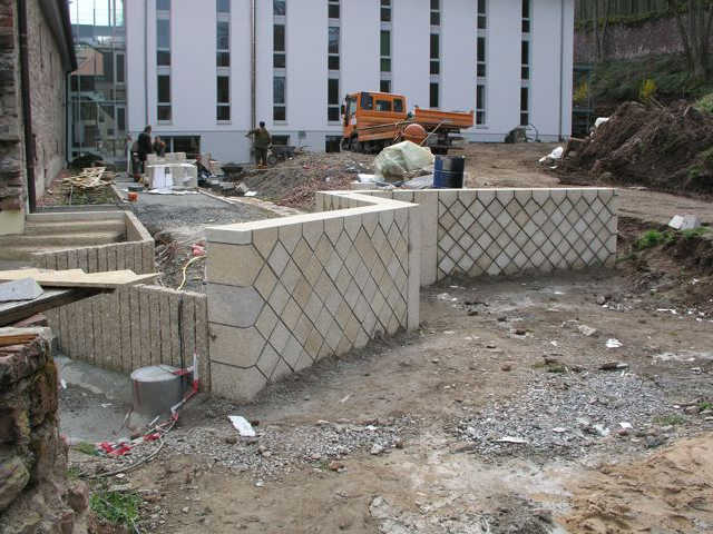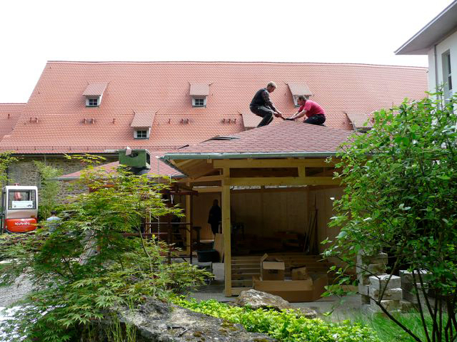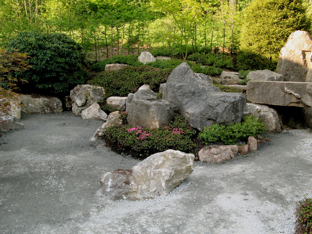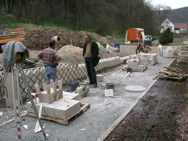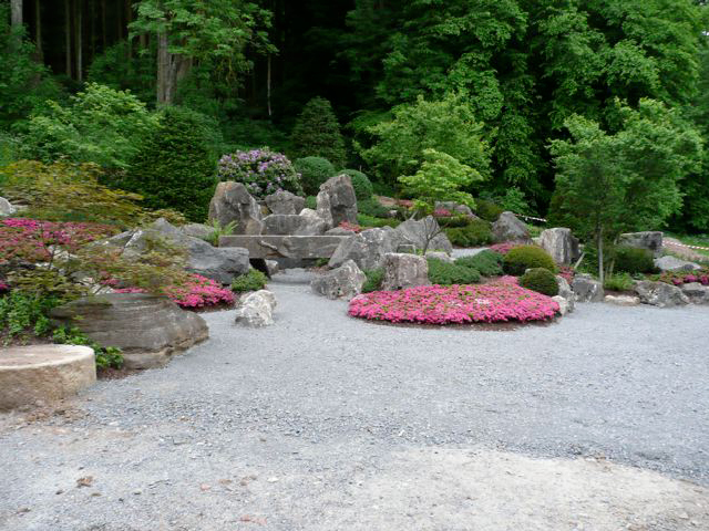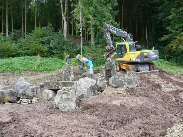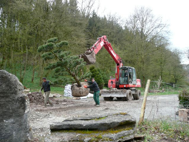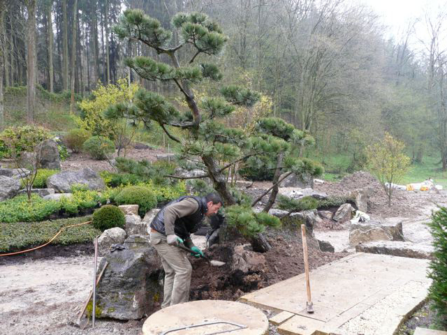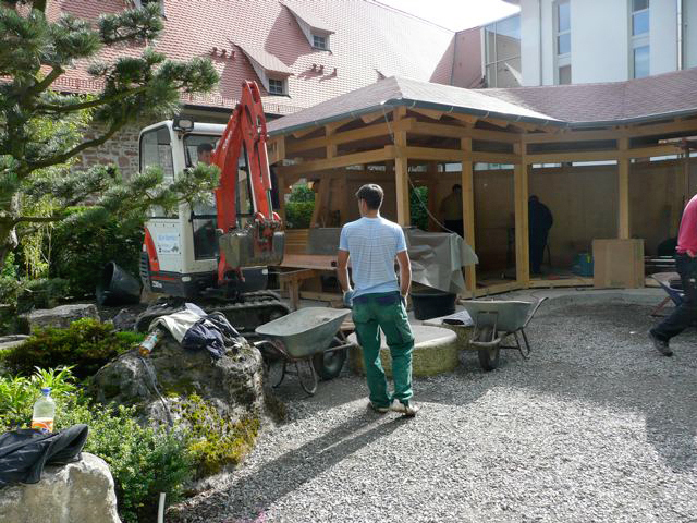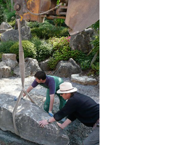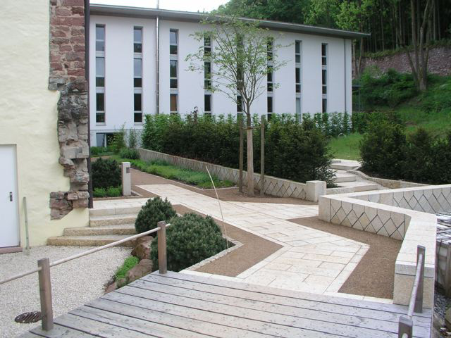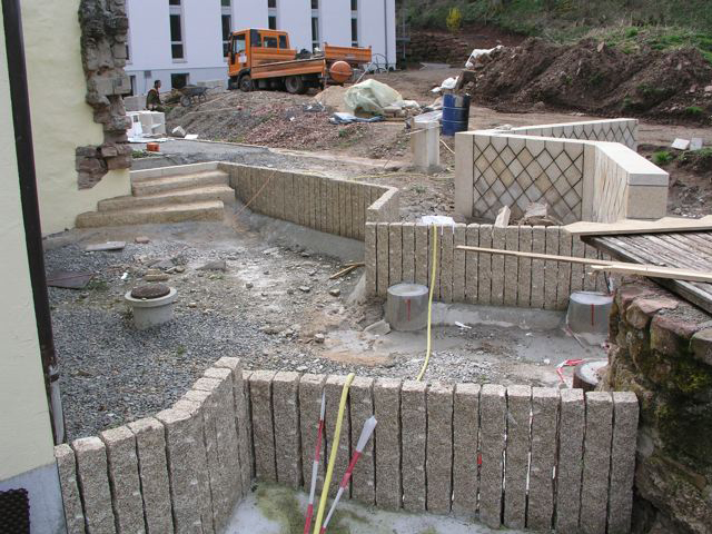 Die Arbeit an diesem Japanischen Meditationsgarten in einer alten Klosteranlage begann mit dem Einfrieden der eigentlichen Gartenfläche und dem Bau von Wegeflächen, Mauern und der Eingangssituation. In einem nächsten Schritt wurden rund 300 Tonnen Felsmaterial gesichtet und im Gelände versetzt. Hauptthema dieser Steinsetzung ist ein Trockenwasserfall mit einem massiven Quader als Brücke, flankierenden Felsen und einer Wegeführung, so dass dieser Garten auch begehbar sein wird. Die nächste Bauphase war die Bepflanzung des Gartens mit großen Solitärgehölzen, Gehölzflächen und Bodendeckern. Im letzten Bauabschnitt, Anfang Juni 2009, wird neben Eingangstor und Holzbrücke eine Meditationshalle errichtet. Im letzten Arbeitsgang wird ein speziell hergestellter Kies im Garten verteilt, der für diesen im „Trockenlandschaftsstil“ errichteten Garten typisch ist.