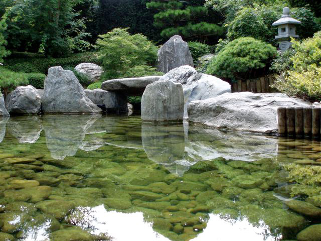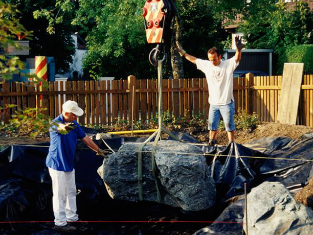 Nach einem gemeinsamen Besuch in Japans Gartenhauptstadt Kyoto wünschten sich die Auftraggeber auf ihrem Heimatgrundstück einen Garten mit der Atmosphäre, die sie in den wunderbaren Gärten dort so sehr berührt hatte. Hauptgestaltungselement sollte ein Wasserfall mit vorgelagerter Felsenbrücke sein, als Teil eines Rundweges um den Gartenteich. Besonders die Suche nach dem ersehnten Felsmaterial und in Grösse und Art passenden Gehölzen gestaltete sich aufwändig. Bei soviel Hingabe an Detaillösungen überraschte es nicht, dass der Kunde die intensive Pflege übernahm und mit selbstangelegten Moosflächen das Erscheinungsbild einer in Deutschland beheimateten Gartenanlage in ungewöhnlicher Weise bereicherte.