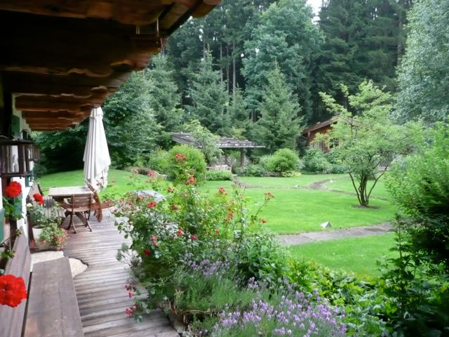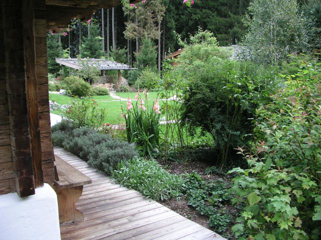 Bei diesem Grundstück war der Außenraum ein wich-tiges Verbindungsstück zwischen zwei Wohnhäusern und einem überdachten Freisitz. Der Freisitz mit seiner Natursteinmauer schließt das Gelände Rich-tung Osten ab, von wo es Richtung Tal steil abfällt. Gleichzeitig ist der Freisitz ein wichtige optische Barriere zwischen Grundstück und einem finster an-mutenden Fichtenwald. Ein kleiner Teich mit Wasser-fall stellt einen weiteren Höhepunkt des Gartens dar. Wichtige Blicke in Richtung Hornbahn wurden frei- gehalten und der Bezug zur offenen Landschaft hergestellt.