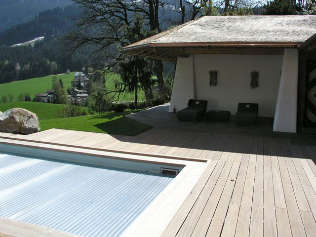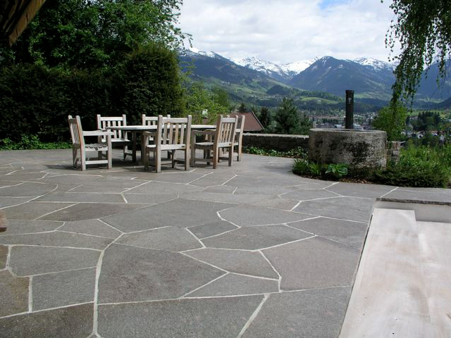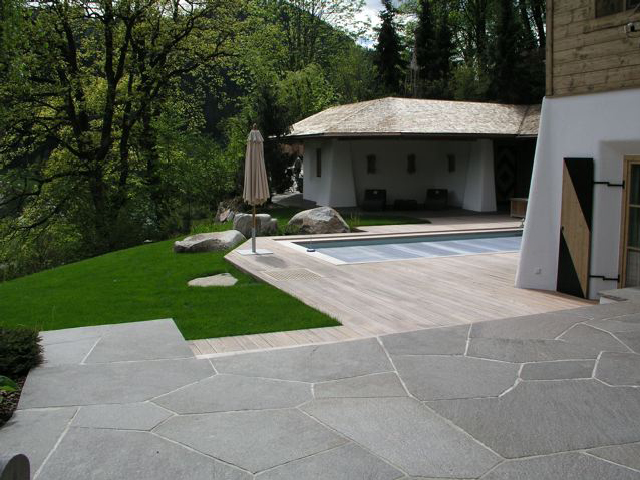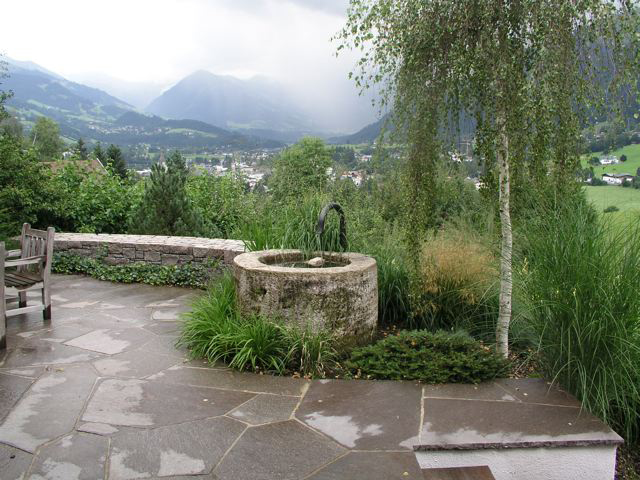 Die Terrassierung des steil abfallenden Grundstücks bildet auf Höhe des bereits vorhandenen Pools eine zweite Ebene. Eine langgezogene Holztreppe verbindet diese Ebene mit der Terrasse im oberen Bereich des Hauses, von wo sich ein grandioser Blick auf die umliegenden Berge bietet. Dieser obere Terrassenbereich wird geprägt durch einen sehr alten Granittrog an exponierter Stelle und eine Hängebirke. Der neugeschaffene Freisitz begrenzt das Grundstück in westlicher Richtung und erzeugt im Bereich des Pools ein Hofsituation. Talseitig wird dies durch eine massive Steinsetzung gegründet, ein Verweis auf die umliegende Natur, in die sich die gesamte Anlage fließend einbettet. Die Gestaltung der Anlage entspricht durch Konzentration der Bepflanzung auf wenige einheimische Gehölze und standortgerechte Stauden dem Gebirgsklima mit seinen kurzen Sommern und langen Wintern und ergänzt die natürliche Schönheit der sie umgebenden Natur.